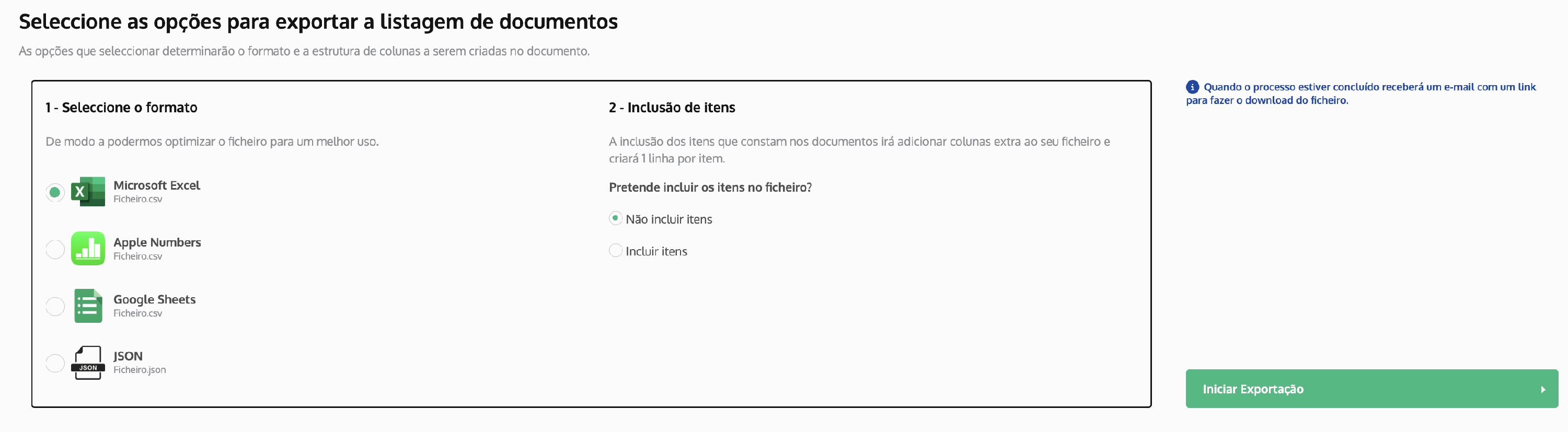 Em seguida, será apresentada uma nova página onde poderá incluir a pesquisa por itens, escolher o formato da exportação e, por fim, clicar em Iniciar Exportação.