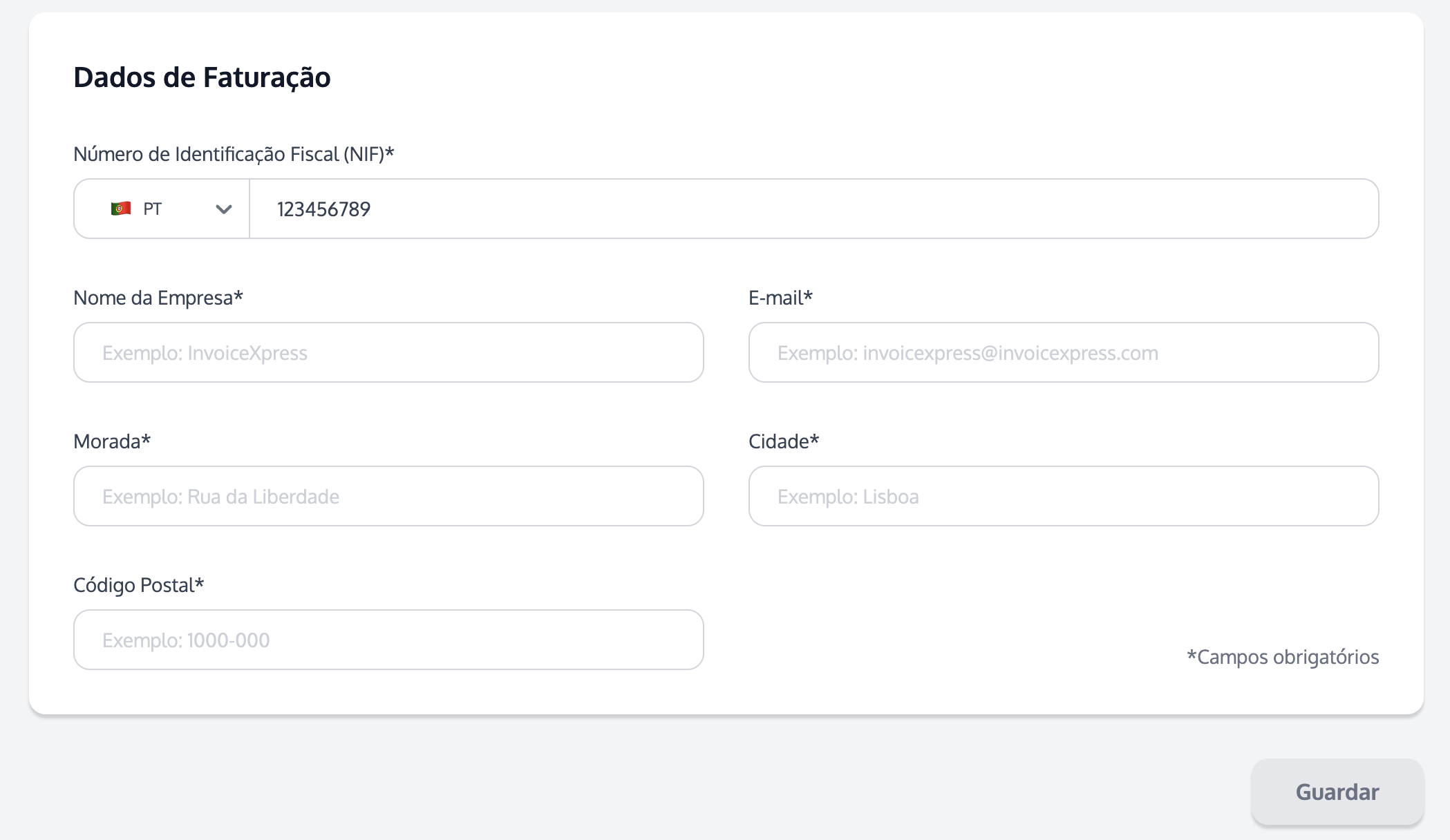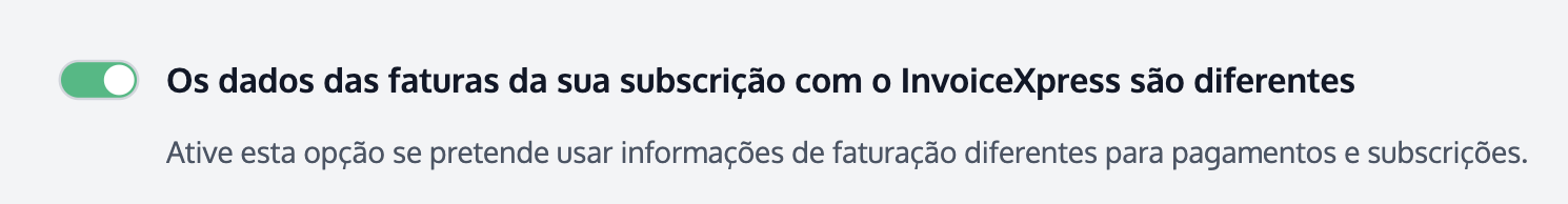 Neste menu pode igualmente configurar os seus Dados de Faturação. Estes podem ser iguais ou diferentes dos Dados da Empresa. Se pretende que os sejam iguais, basta não ativar a opção no topo da página. Se pretende que os Dados de Faturação sejam diferentes, ative a opção no topo da página.