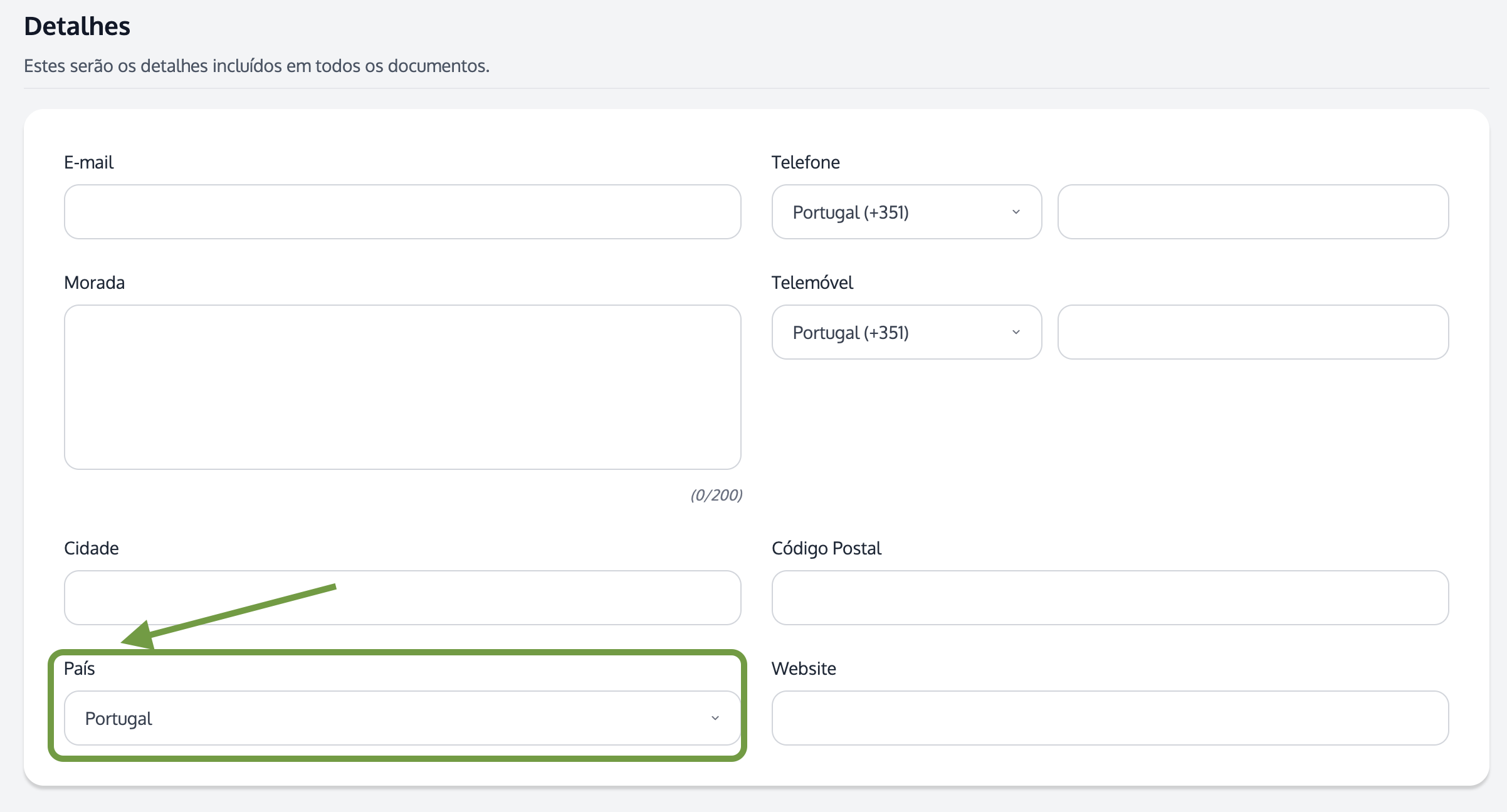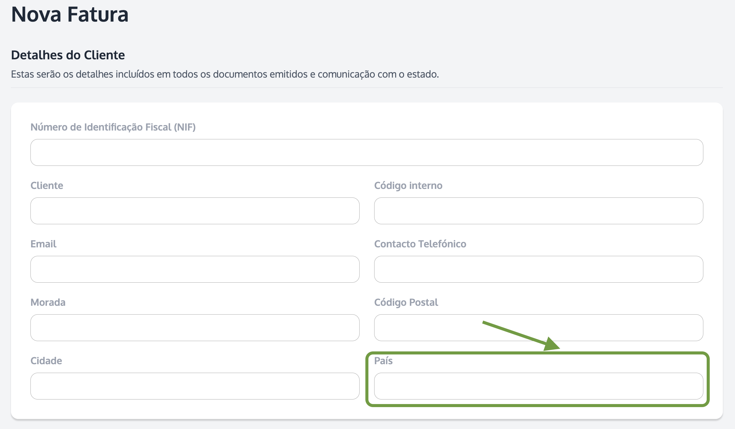 Pode seleccionar o país do cliente do campo respectivo quando cria o contacto.