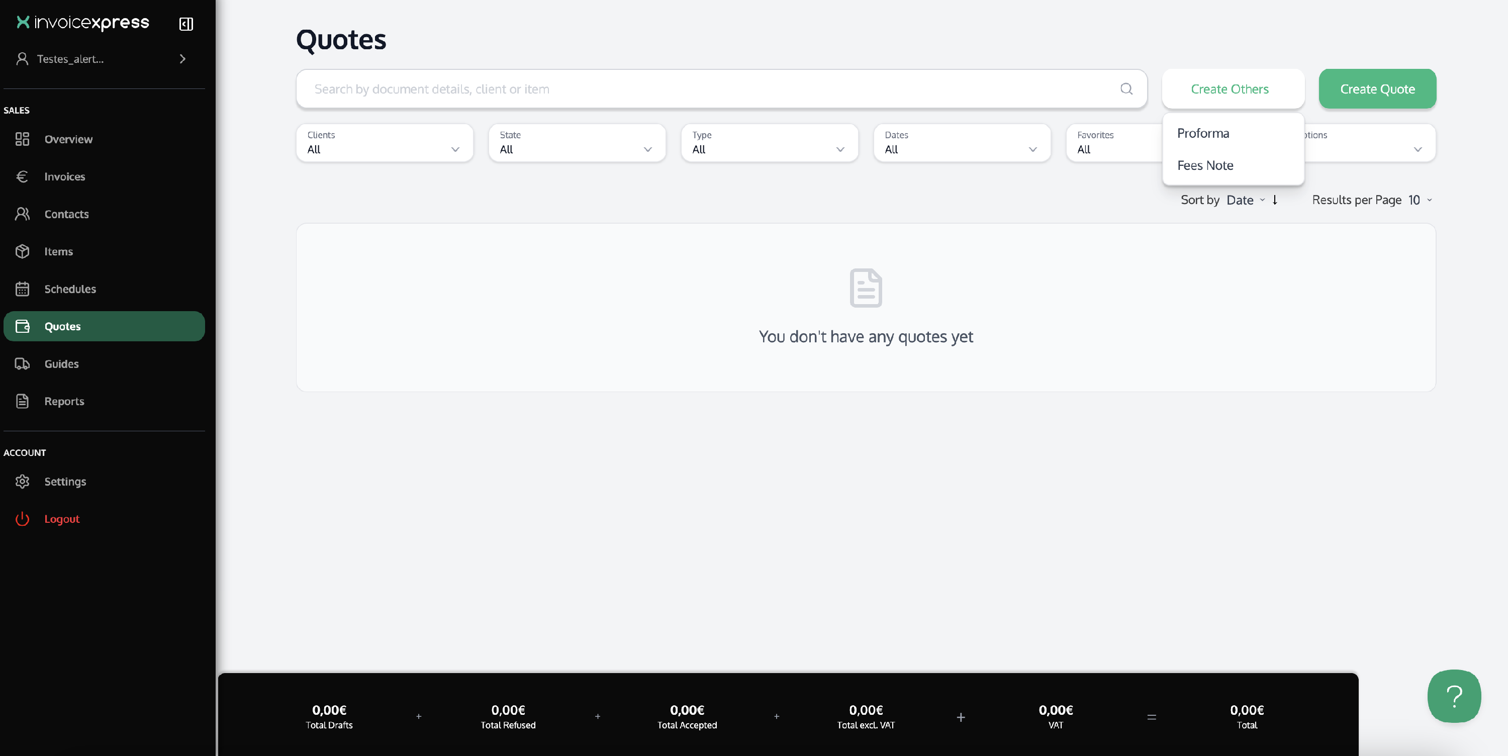 To create a Quote, Proforma or or Fees Note, go to the Quotes menu (in the vertical menu on the left):